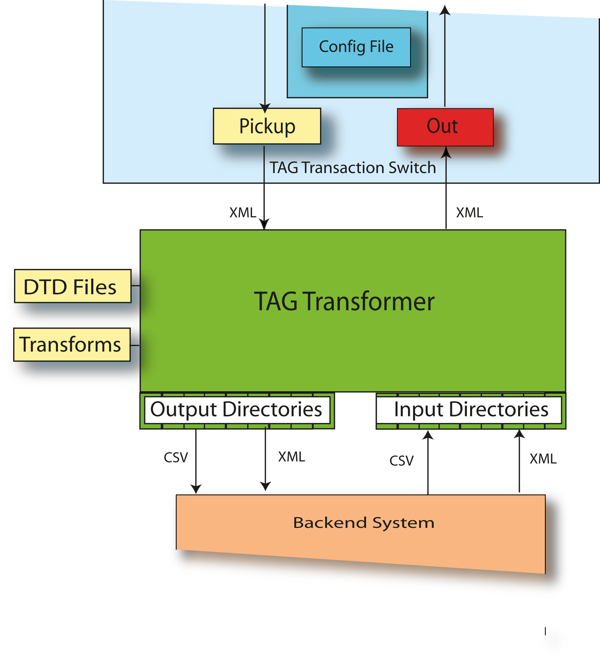 The Transformer converts files between formats as they move between a backend system and the TAG Transaction SwitchTM. On the Outbound leg, the Transformer handles conversions from flat ASCII files like CSV files to XML or from XML to XML. The resultant XML file is usually dropped into the Switch’s Out Directory. The specific transformation depends on which input directory the file is placed into by the Backend System plus an entry in the Configurator File which determines what transforms to perform on that specific directory. Input and output directories are also specified in the Configurator File. All transforms use XSLT stylesheets which are stored in the Transforms directory. XSLT is a language for transforming the structure of an XML document. You must create your own stylesheet for each DTD and store it in the Transforms directory. The Templates directory contains DTDs for incoming documents with DTD’s that are resolved locally.On the Inbound leg, the Transformer takes files from the Switch’s Pickup directory and converts these XML files to either flat ASCII or XML. For example, all XML documents containing ePSA compliant transactions could be converted to a s et of CSV files recognized by the Backend System.